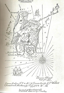Muitas peripécias vão acontecendo até o jovem Jim se ver num navio partindo em busca de um tesouro. O mapa mostra a ilha ficcional onde se desenrolará a aventura prinicipal.
